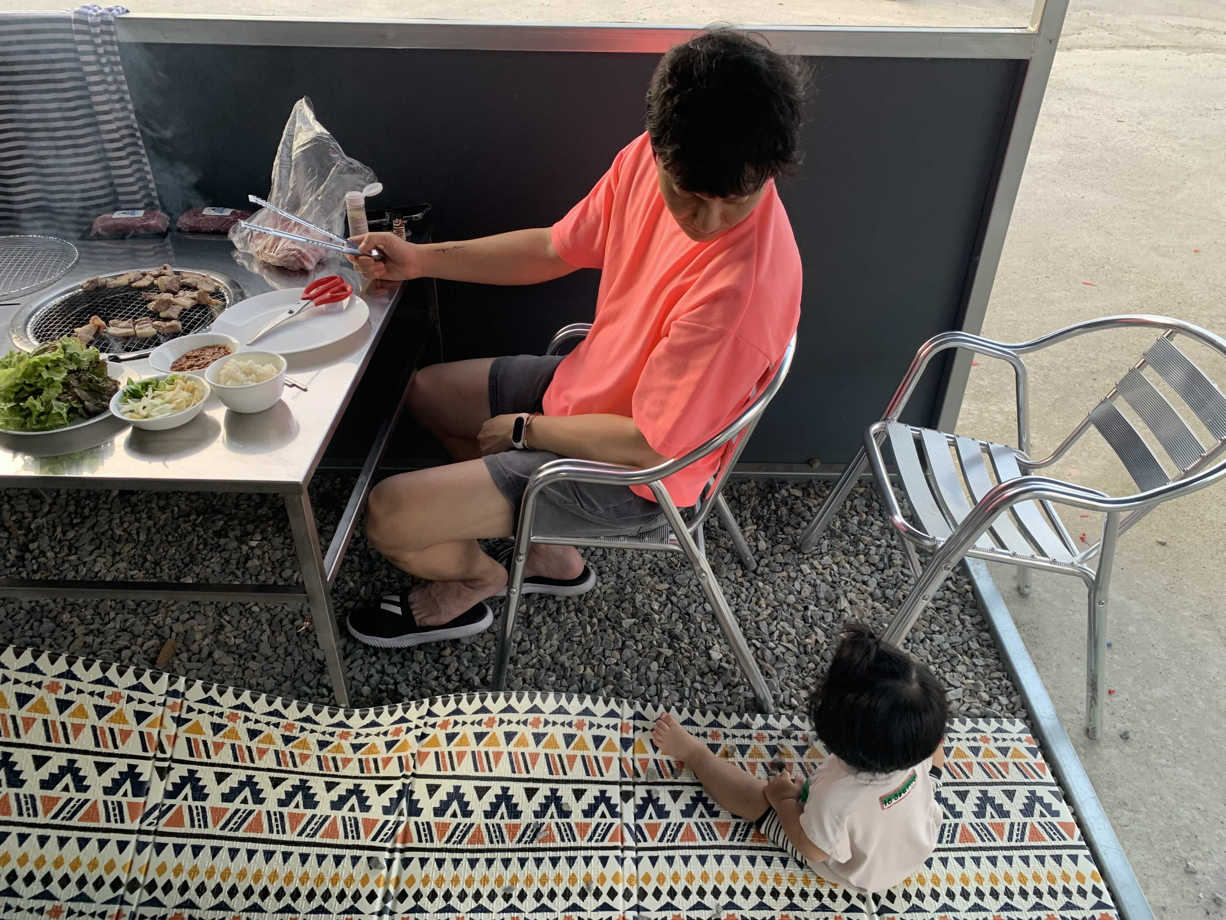 애둘애비는 한손에 애안고 고기를 굽습니다. ㅋ